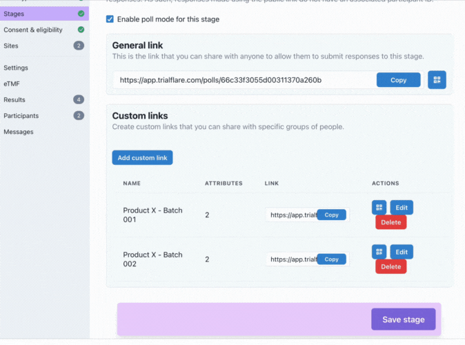 Trialflare generates both custom URLs and QR codes for your poll automatically. You can share these with poll respondees however you see fit. You can even add a custom-branded QR code to your product packaging or inserts for consumers to scan.