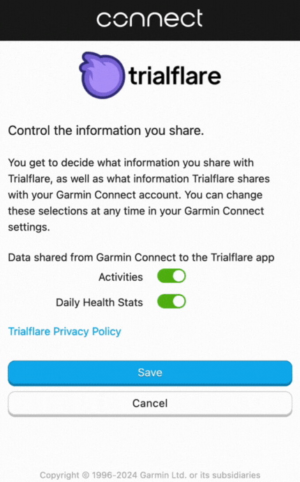 Once the participant has logged into their Garmin Connect account, they will be asked to agree to link this to Trialflare to collect data.