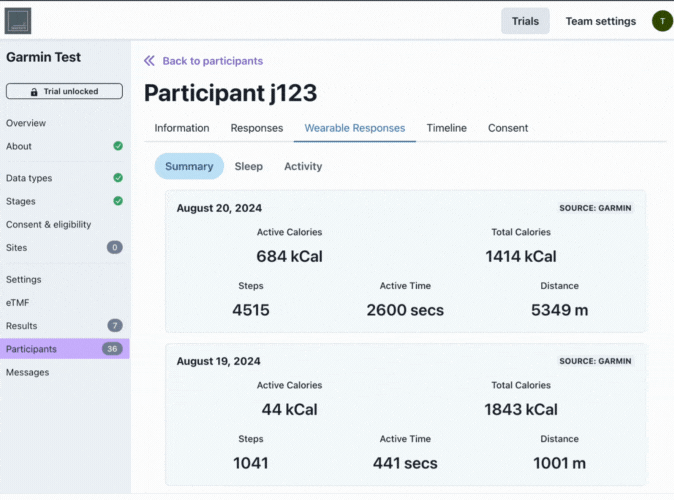 If you're interested in collecting real-world data (RWD) from wearables, Trialflare has integrations with Garmin devices through our Garmin Partnership. With the partnership, you're able to collect ongoing metrics on sleep, stress, heart rate, respiration, activity, calories and more.